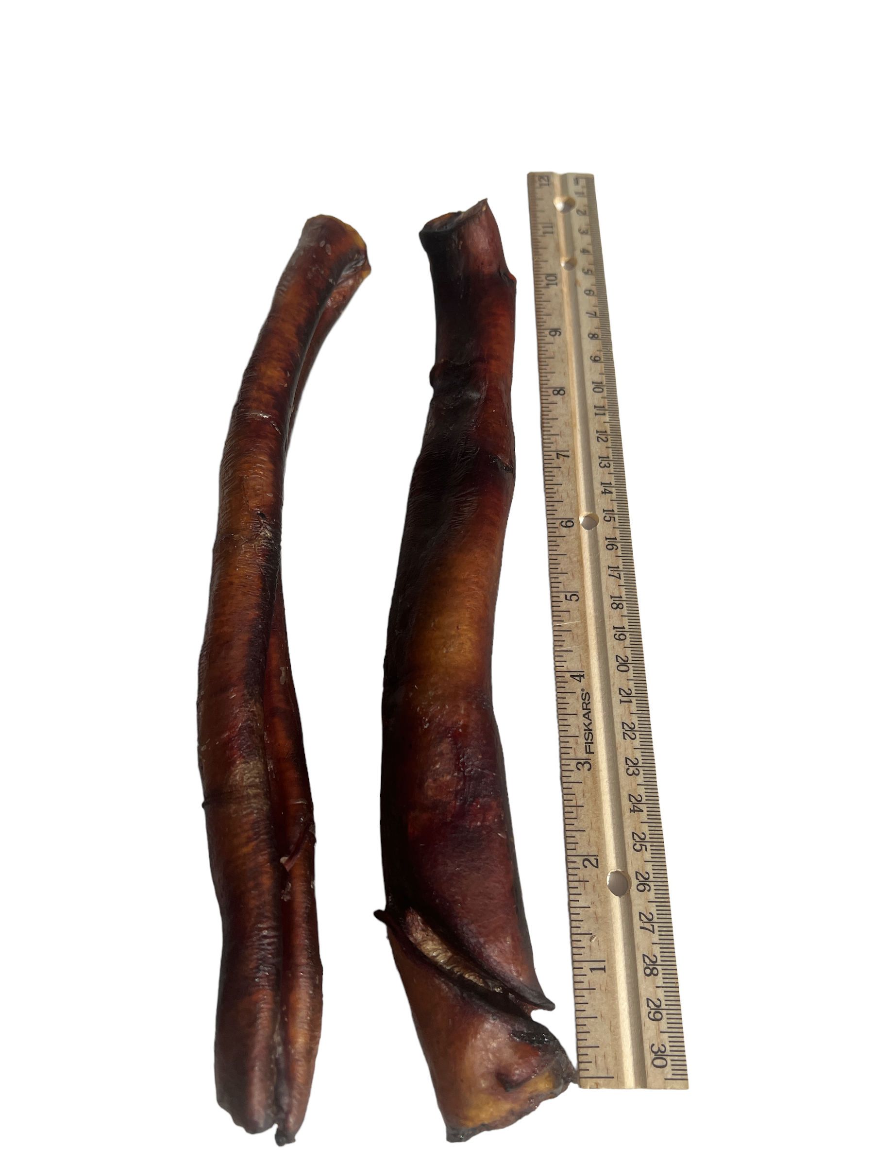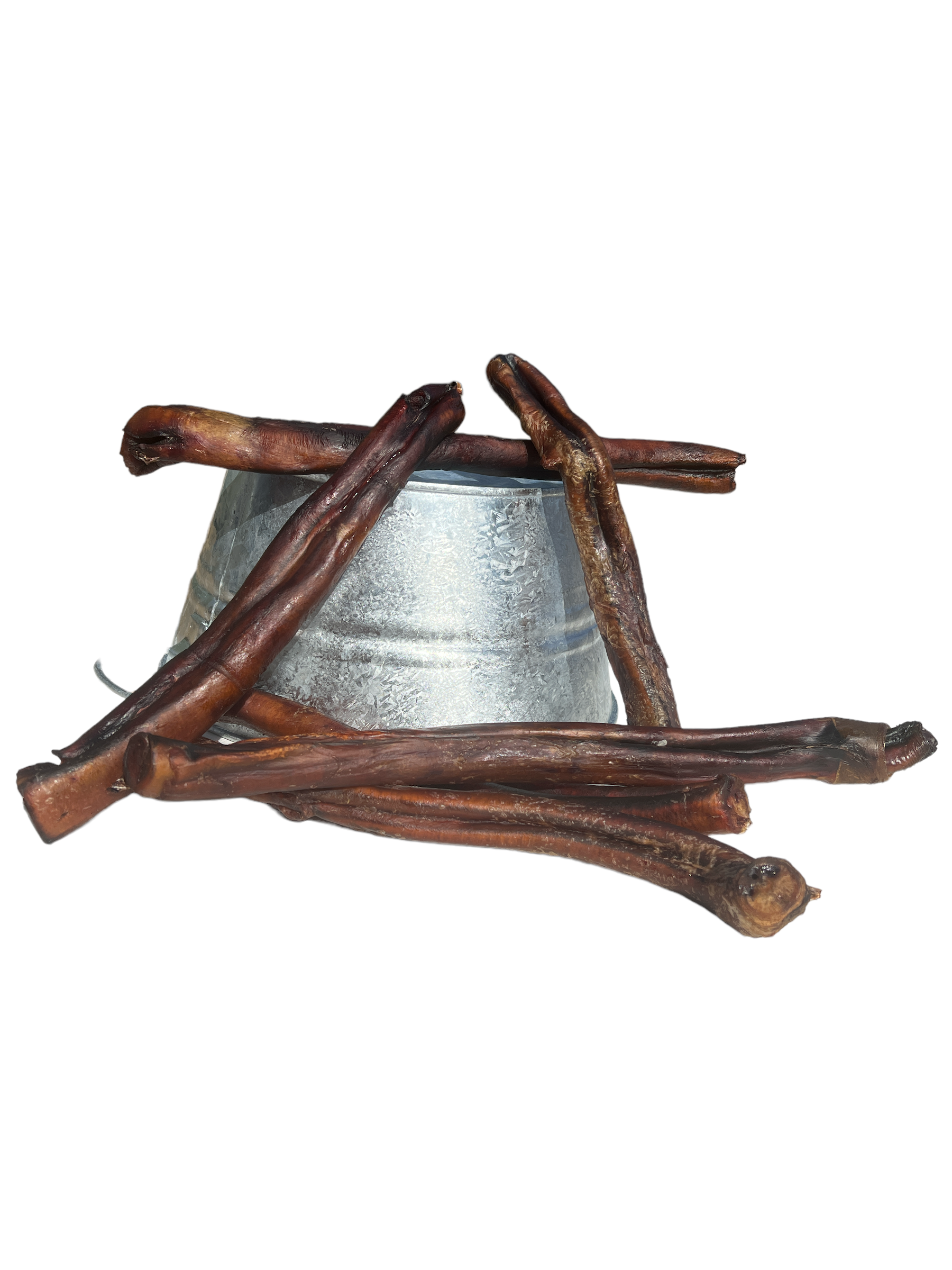 Bully Sticks are an all-natural, longer lasting chew safe for most dogs. They are made from 100% steer or bull penis, also commonly referred to as pizzle. They are bone and rawhide free. Since bully sticks are an all-natural, hand-made product, the shapes and sizes will vary with every stick.