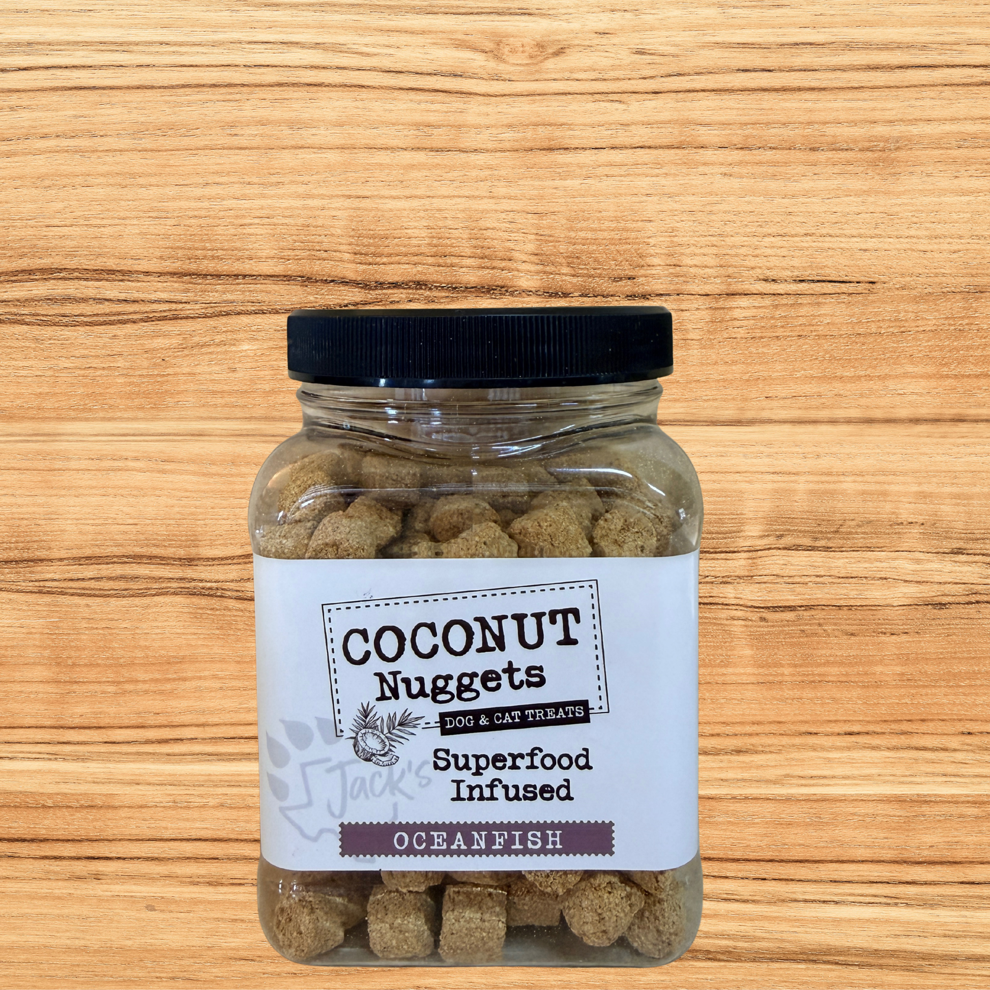 Jack's Premium Coconut Nuggets are made with organic coconut flour and superfood fruits, veggies and spices. These treats are easily digestible, high in protein, and low calories. They are an excellent training treat and are a great option for dogs with food allergies or sensitivities. These treats are made without grains or preservatives. Coconut Nuggets are an all-natural treat for both cats and dogs that can be used for training, food toppers, or just a healthy reward.